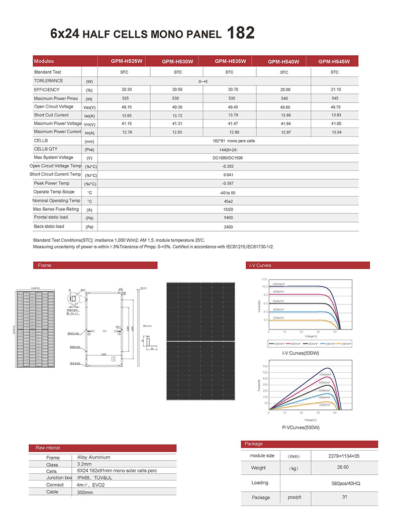 Mono 182mm خلايا نصف قطع الألواح الشمسية 144 خلايا 545W
